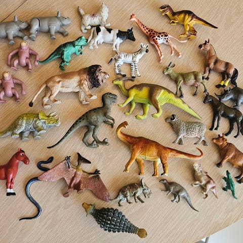 En samling plastfigurer av dyr, fra 1950-tallet (?)