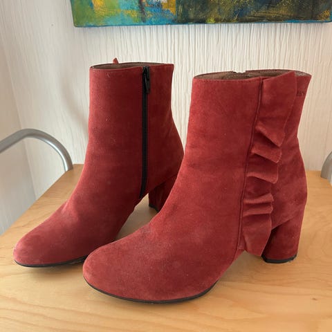 Pent brukte støvletter fra See by Chloé i semsket skinn. Bildene ble nok bitte litt mer knallrøde enn de er i virkeligheten. Str. 37.