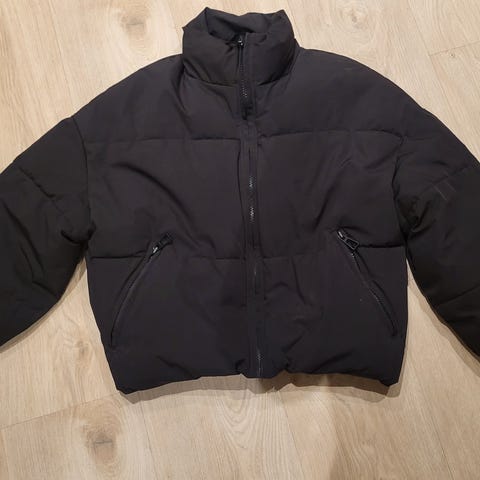 Svart velur boble jakke, str S. Brukt men pent brukt, ble et lite hull ved inngangen til lommen men det er sydd. Veldig fin og unik jakke. Selges da den er blitt for liten. Str S