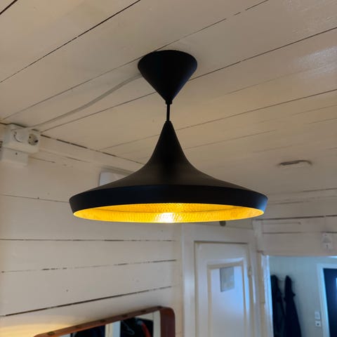 Dansk taklampe i kobber og teak. Regulerbar. H 38, D 33