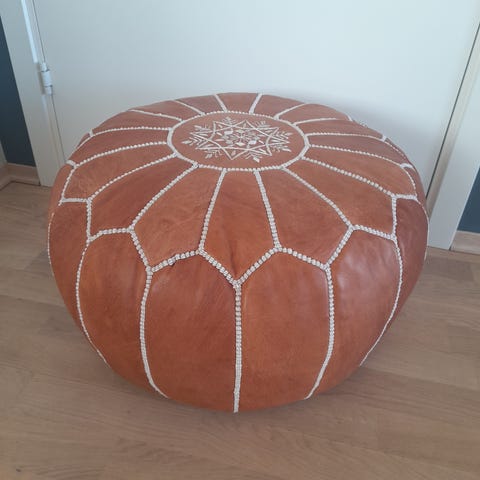 Håndlaget rund marokkansk puff i ekte skinn. Puffen har matchende og kontrast-skapende broderier, og den kan plasseres i alle rom. I tillegg til å være et stilig innslag i hjemmet har puffen en perfekt høyde som en ekstra sitteplass.