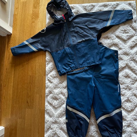 Hel og grei. Mangler hette.Uten fôr. En mer slitt regndress i str 110 kan følge med.