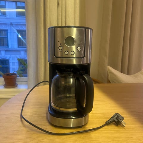 Fungerer som den skal. Med skjerm og timer som man kan bruke for at kaffemaskinen begynner å lage kaffe før man våkner.