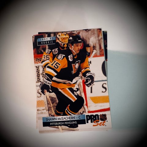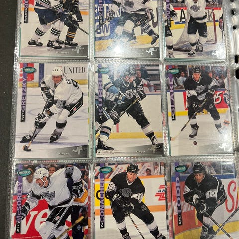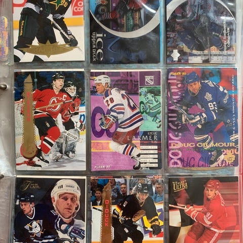 Alle kort kjøpt nye av meg og har ligget i individuelle plastlommer i permer siden kjøp. Alle kort er 100% strøkne. Her finnes også noen sjeldne kort av legendariske spillere som f.eks Wayne Gretzky.