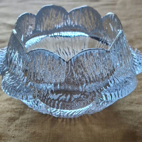 Magnor bolle laget av klart glass. Håndblåst. Designet har en unik, teksturert overflate. Perfekt for servering av salater, frukt eller snacks. Ca 19,5 cm diameter og 7 cm «høy»