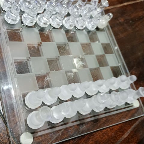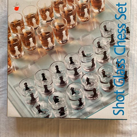 Selger et lite sjakkspill, Glass Chess Set. Str. 19 x 19 cm. Ikke brukt. Ligger i orginaleske. Nypris på nett er 650,-