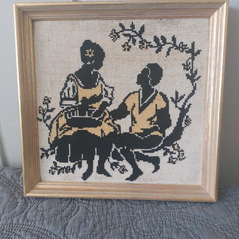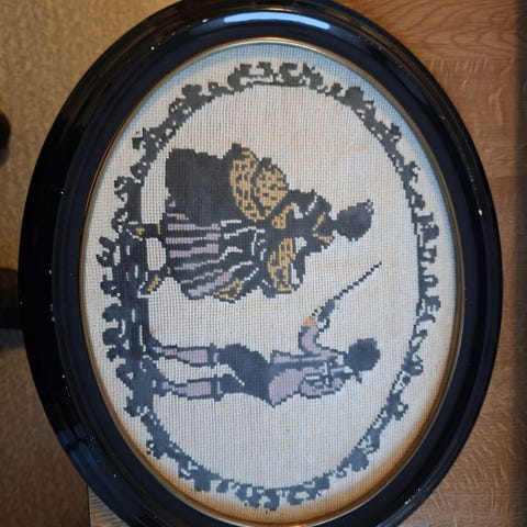 Vakkert gammelt brodert bilde i tidsriktig ramme. Nydelig håndarbeid og farger.