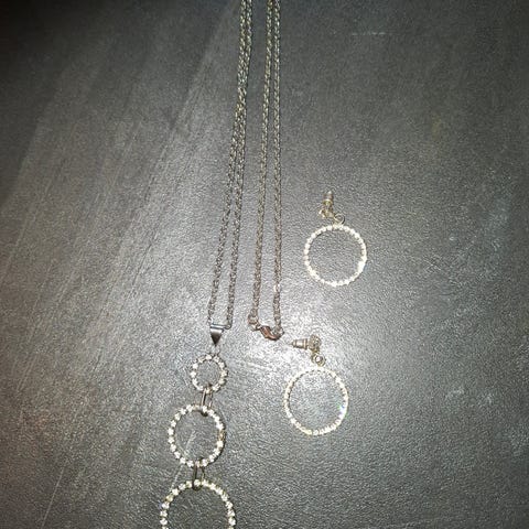 Smykker fra merket CHIQUE. Et langt kjede (mangler 1 sten), matchende øredobber og et kortere hjertekjede. Pent brukt.