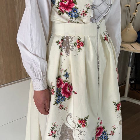 Med bunaden medfølger linskjorte,, belte, veske, forgylt sølv og sko (str 38).