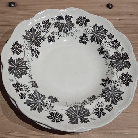 Meget stort, dekorativt glassfat, 46 cm i diameter, 9 cm i høyde. Hvitt glass med sort mønster.