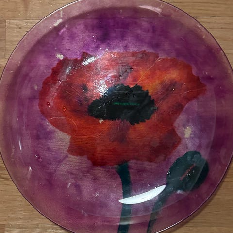 Selger dette fine, gule glassfatet med rød valmue fra Gallerie Ene.