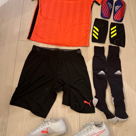 Selger en blå fotballtrøye i str.152, shorts i str.140 og leggskinn- 50 kr.pr.stk. (Nikkers, rød trøye og sko er solgt)