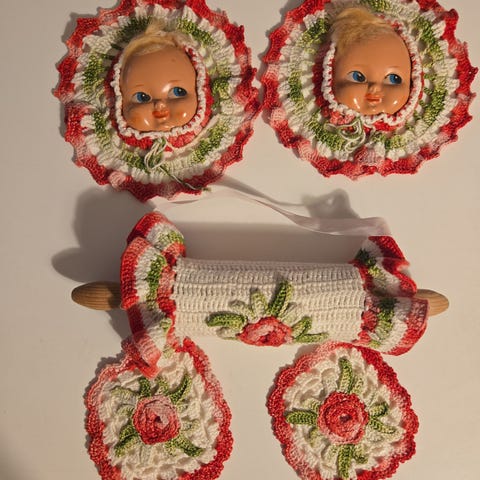 Retro Kjøkkenpynt, koselig heklet par, til pynt på kjøkkenet, laget for ca 60 år siden, i bommul. Kr 80.kan sende,