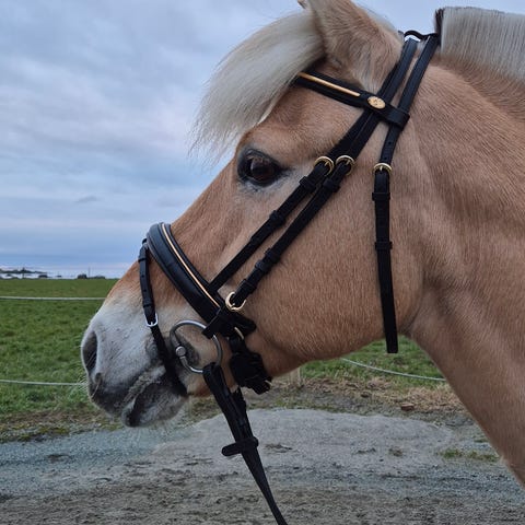 Håndlaget hodelag til islandshest klart for salg. Laget i biothane som er vedlikeholdsfritt og like fint år etter år.