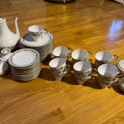 Et eldre tidløst kaffeservise med 7 kuverter med kvalitetsporselen og med gulldekor fra svenske Hackefors. Alle deler er hele og pene, uten noe bruksslitasje. Ut fra det grønne stemplet, er disse kuverten fra mellom 1940 og 1960. Koppene er ca. 7cm høy, og diameter på toppen ca. Ø7,5cm, asjettene er ca. Ø17cm, skålene eller tefatene er ca. Ø13,5cm.