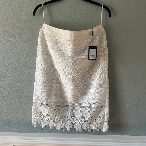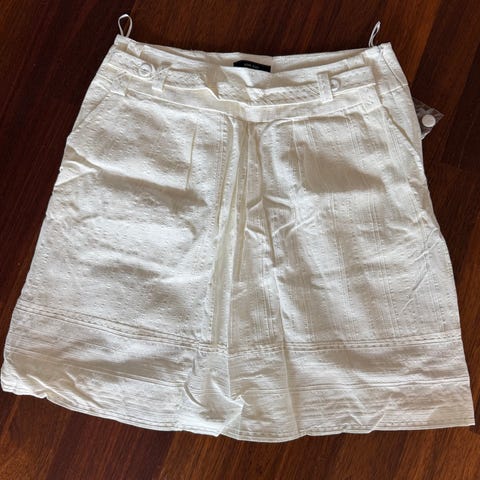 Lekkert hvitt skjørt med blomster på fra L’evolution selges rimelig. Str. 38. Aldri brukt; lappen henger på.