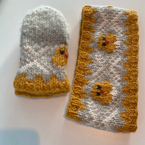 Mariusmønster med påskevri. 50 cm rundt, 9 cm bred. Strikket i Sandnes ullgarn, klør ikke. Passer til barn, perfekt å legge i påske-egget!