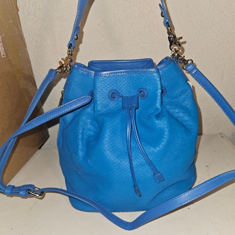 Kul, liten gullfarget veske fra Hush Puppies. Kjøpt i Dubai. 25 cm lang og 20 cm høy. Følger med skulderrem. Er ubrukt. Kan sendes etter 14.august.