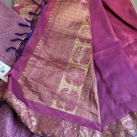 Ny Saree i mørk fuchsia farge med gulltrå og gullperler mønster. Myk stoff og følger med stoff til