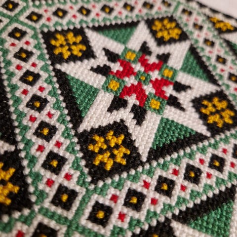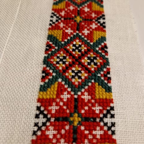 Selger en umontert bringeduk til hardangerbunad. Brodert med korssting og perleinnstikk. Størrelse: 20cm x 15cm. Frakt tilkommer