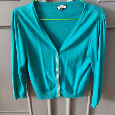 Brukt veldig få ganger . Ligget i skuff 8-10 år. Vasket en gang. Her nyvasket. Fargen er misvisende. Vakker dyp rød. Fin over ermløs kjole . Kjøper betaler porto.