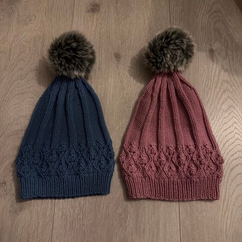 Denne har vi aldri brukt, hjemmestrikket lue i ull med rosa dusk
