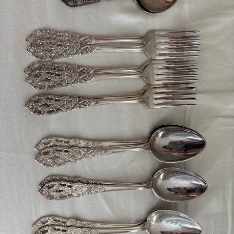 Har noen deler i Dobbel Rokokko sølvmønster. Sølv Brødrene Lohne.