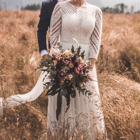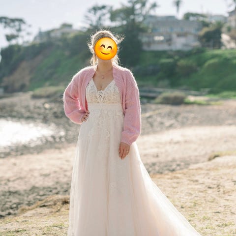 Jeg er 160 cm høy og brukte hæler som var ca 8 cm. Kjolen er veldig behagelig på og sitter på plass hele dagen. Renset etter bryllupsdagen.