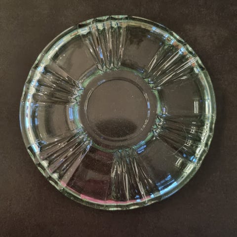 6 asjetter av eldre årgang med litt grønnskjær i glasset. Diameter 15 cm. Har noen bobler i glasset og er trolig kjøpt som b-vare. Selges samlet for kr 60,- pluss evt. frakt.