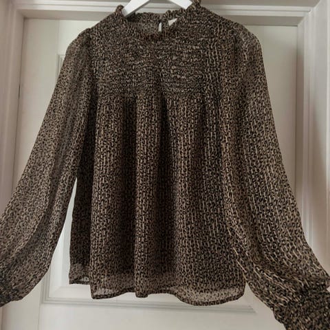 Topp i størrelse L som tilsvarer 38-40. Puffermer gjør den litt pyntet. Kun brukt en gang