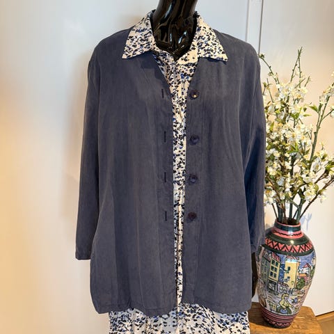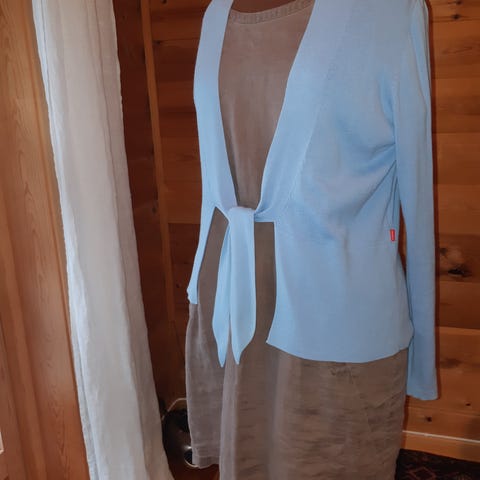 Lekkert sett fra Masai. Skjørt i 100% viskose. Størrelse M. Rett i fasongen med strikk i midjen og liten splitt nede i den ene siden. Lengde 93 cm. Midje 88 cm. (kan strammes inn). Jakken er i str. S, innsvinget med liten knapp og to knapphull, dvs. kan reguleres. 55% viskose og 45% bomull.