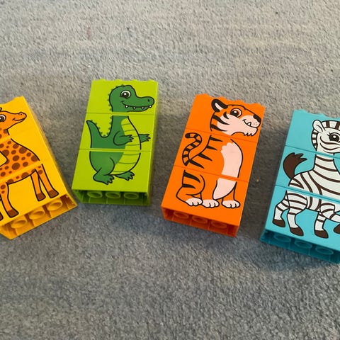 5 søte klosser med ulike motiver, av stoff og skumgummi, med ranglelyd.
