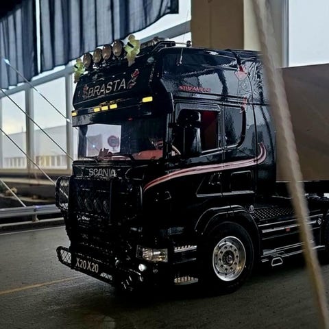 Lite brukt , Elektriske støttebein og trådløse baklys. Ny fjernkontroll, byttet motor. Bil og henger er foliert. Er klargjort for sving på bakre aksling på henger. Servonaut motor og gear.