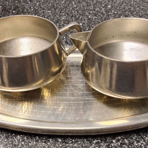 Retro norsk tinn fløte sett med brett, fra 50/60 tallet. Diameter åpningen, 5 cm høyde 5 cm brettet måler 18X9 cm. Selges for kr 85- Kan leveres i Oslo øst og nord og Lørenskog for kr. 60- Har du sett mine andre annonser, trykk på navn/ bilde.