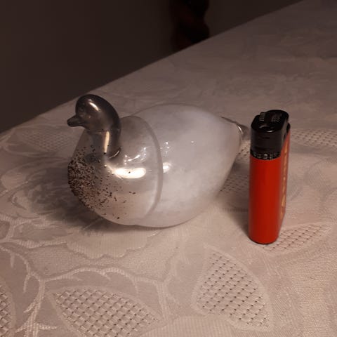 Høyde 21cm. Diameter nede er 16cm. Har kule på siden for å skyve stearinlys opp etterhvert som det brenner ned.