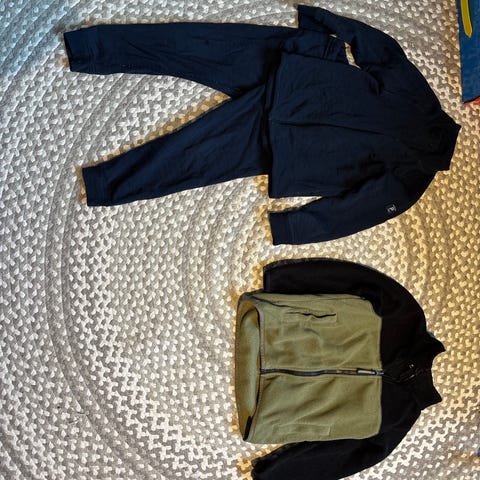Pent brukt ytterklær. Vært kjempe fornøyd med lager 157 klærne. Noe er lite brukt. Strikka på buksa er hele. Det skal ikke være hull i klærne. Kan ikke se noe flekker. Bare litt støv etter lagring. Fra røyk og dyrfritt hjem