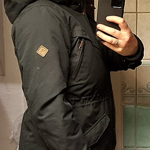 Med avtagbar hette, vattert/foret, vann-og vind-avvisende, liten splitt bak, lommer med klaffer, glidelås og trykknapper i front.