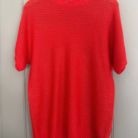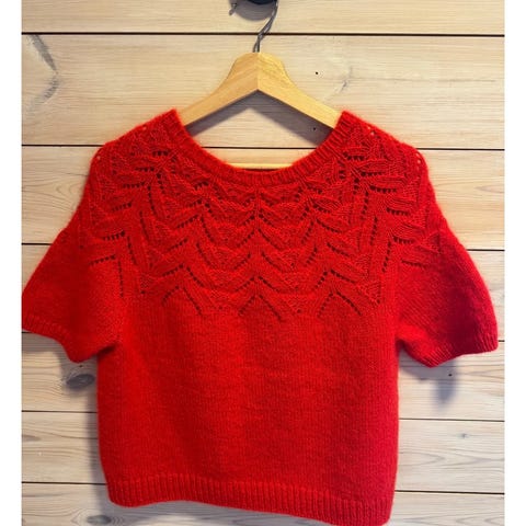 Hjemmestrikket genser med korte ermer, oppskrift Daisygenser fra Pickles. Strikket i garnet Pickles Tjukk Merino, farge bringebærrød. Størrelse S.