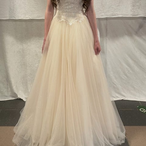 Selger en helt vidunderlig champagne farget kjole i håndlaget blonde foran og bak, og med nydelige steiner og strass. Underskjørt og tyll over. Glidelås i siden. Kjolen passer en str S (til liten M)
