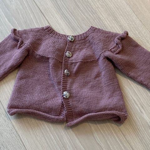 Strikka babyjakke til jente etter mønster frå Pickles.no, i garnet Pickles Extra Fine Merino. Str 6-9 mnd.