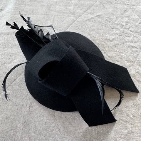 Enkel, pen tidløs vintage hatt i sort ull m bånd rundt bremmen. Ca cm mål: 34x32 inni ved ripsbåndet 19 x 16,5. Se bilder. Prikkene på bilde /hatten er sollys! Selges 750.- Sender m stor norgespk + emb hvis du ikke henter hos meg.Ny pris 350.-
