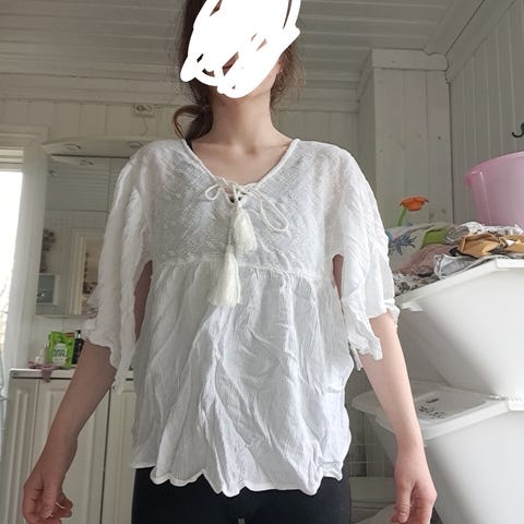 Sval topp i hvitt med sorte striper. Kortere foran, splitt i sidene, skjulte knapper, fine folder øverst i ryggen. Perfekt under en dressjakke, fin med et belte i midjen +++. 100% viskose. Romslig i størrelsen. Sender gjerne📬