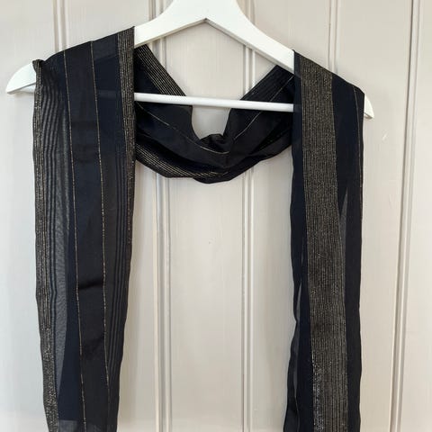 Skinnende paljetter som danner blomster. Fint sjal / skjerf Str 170 cm * 47 cm. Kantsatt med paljetter/perler. Blomster broderier i paljetter. Kan pynte opp et antrekk du allerede har. Solid og fint laget. Noen bretter etter lagring.. Sort og kan passe flere antrekk.