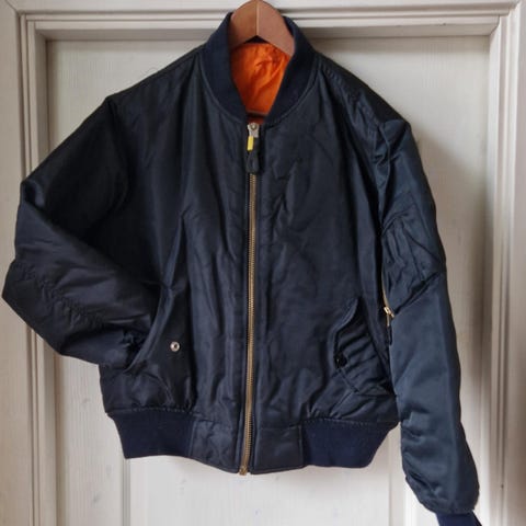 Tynn svart bomberjakke til herre, tynt lett stoff, tror det til dels er vannavstøtende/vindtett.