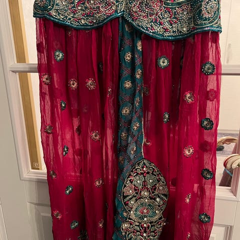 Blå kjole i str 38, paljetter rundt halsen og og armene i gull farge. Halen er lang.