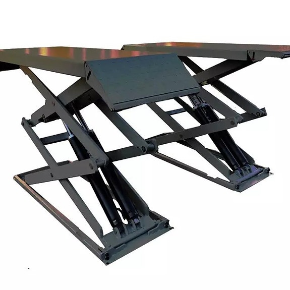 Hydraulisk løftebukk med automatisk låsing i begge søyler. Den er utstyrt med lave løftearmer med justerbare løfteputer, i tillegg medfølger adapter for høye biler. Elektrisk aktivering og deaktivering av låsing, ved heving og senking.