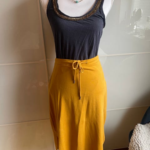 Asymmetrisk skjørt av merket Arcitect. Dekor nede. Snøring i livet. Midje 38x2, lengde 71-87. Lin/rayon.