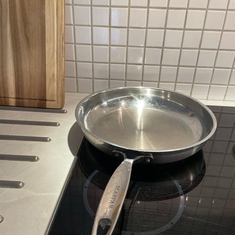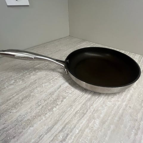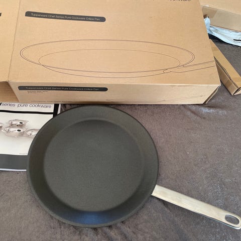 T-Chef stekepanne fra Tupperware prøvd 1 gang. Går ikke på induksjonsovn. Nypris 1998 selges 750 og evt porto ved sending..