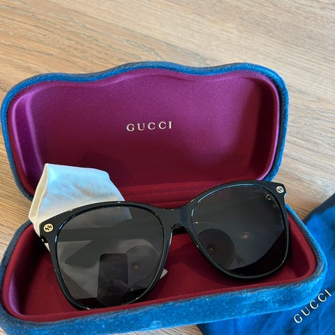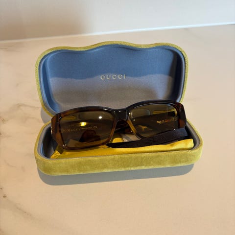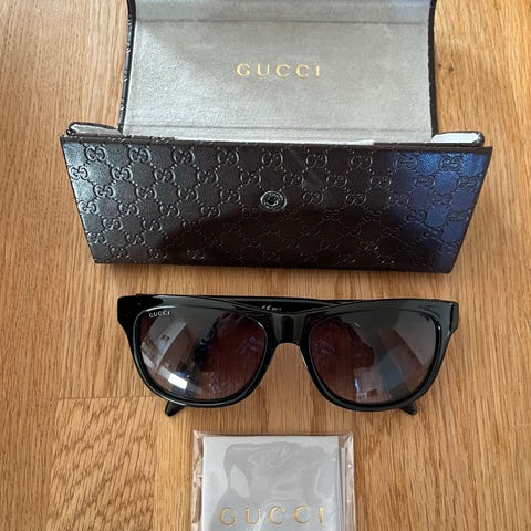 Pent brukte - 3 år. Gucci solbriller selges fordi jeg har kjøpt nye. Ingen bruksmerker på solbriller eller etui. Nypris var kr 2700. Kan sendes mot betalt frakt.