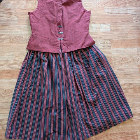 Hedmarksbunad str. 38 rustrød vest.stripete skjørt tror den er mere en 38 str.